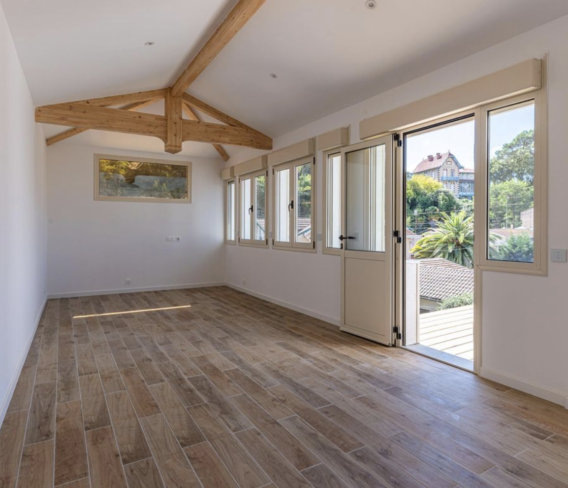 Le salon orienté sud-sud-ouest offre une vue imprenable sur les villas de la ville d’hiver, avec une charpente apparente ajoutant une touche de charme à cet espace convivial.