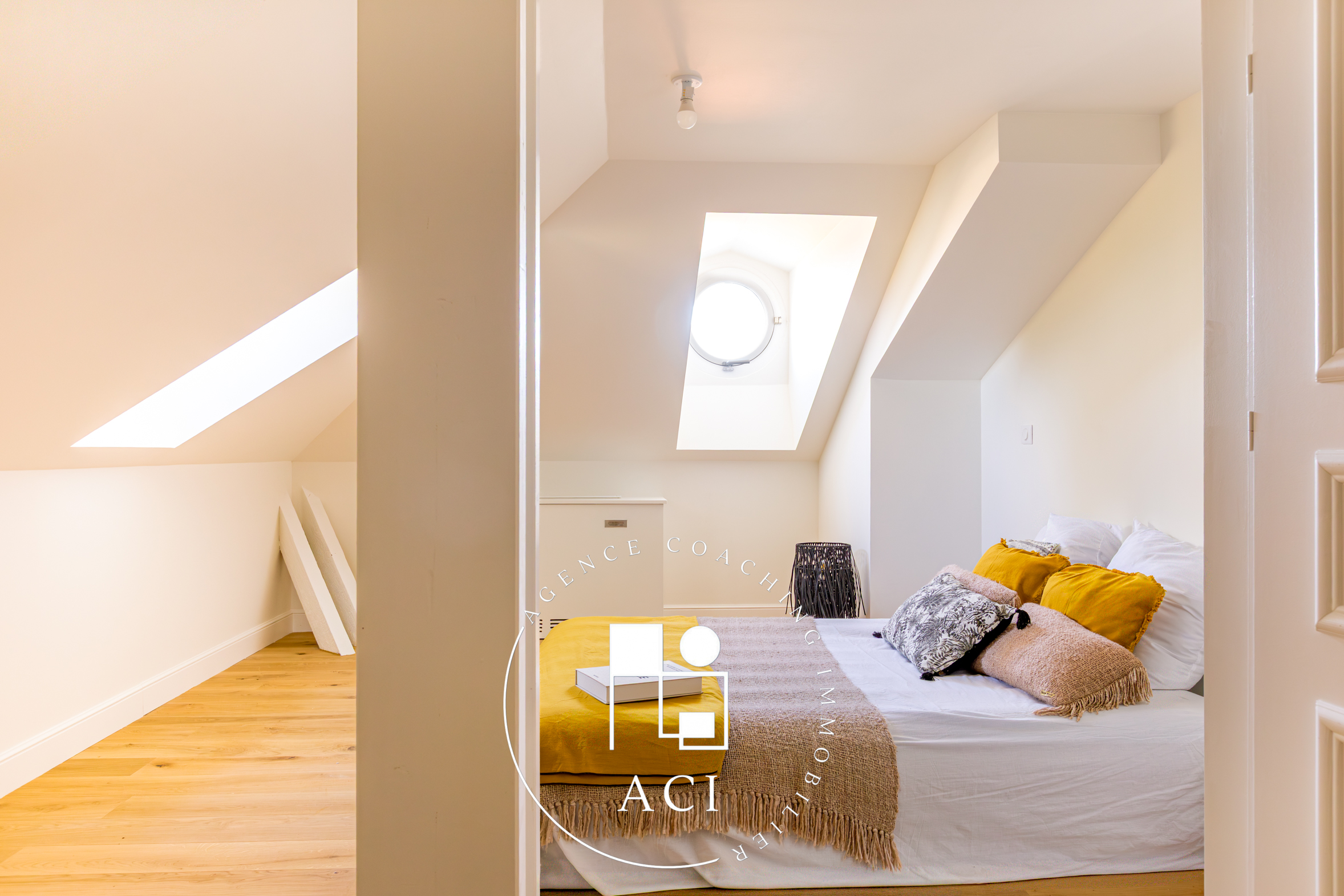 À l’étage, en duplex, vous découvrirez une belle chambre pleine de charme, avec poutres apparentes, salle d’eau, toilettes séparées et rangements. Cet espace offre également des surfaces complémentaires sous 1,80 m, idéales pour optimiser le confort et le rangement.